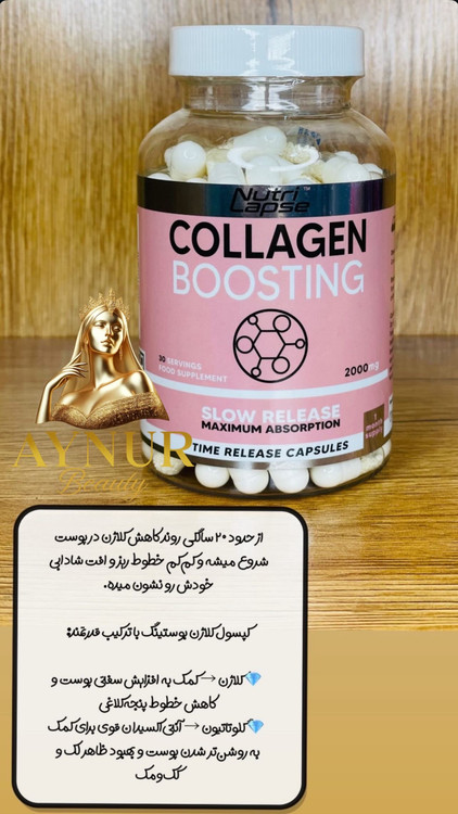 كپسولCollagen Boosting از برند معتبر Nutri Lapse، تركيبي قدر تمند از بيوتين، كلازن دريايى هيدروليز شده، هيالورونيك اسيد وال-كلوتاتيون است كه به صورت تخصصى براى جوانساز پوست، روشن كنندكَى، تقويت مو و استحكام ناخن ها طراحى است